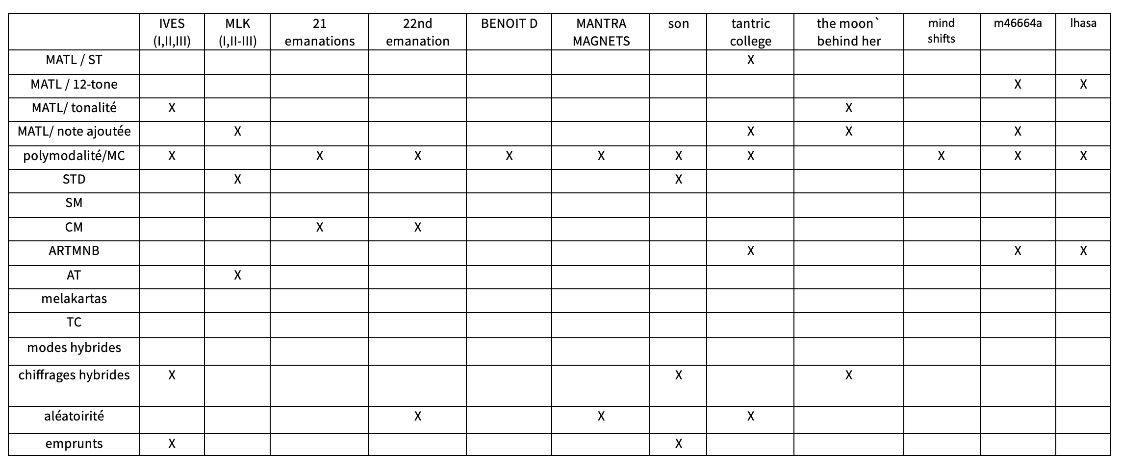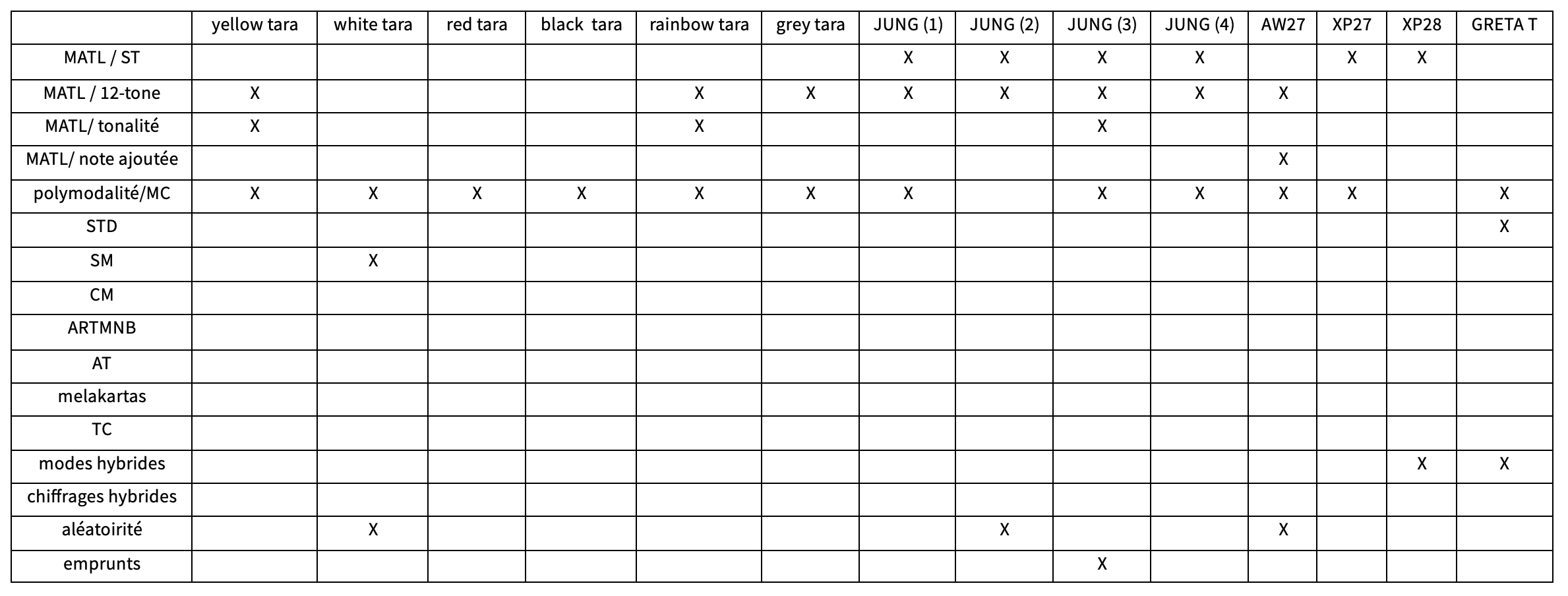ST = signatures tonales / SM = signatures modales / CM = conduites modales / STD = subsets tonaux disjoints / TC = talea color